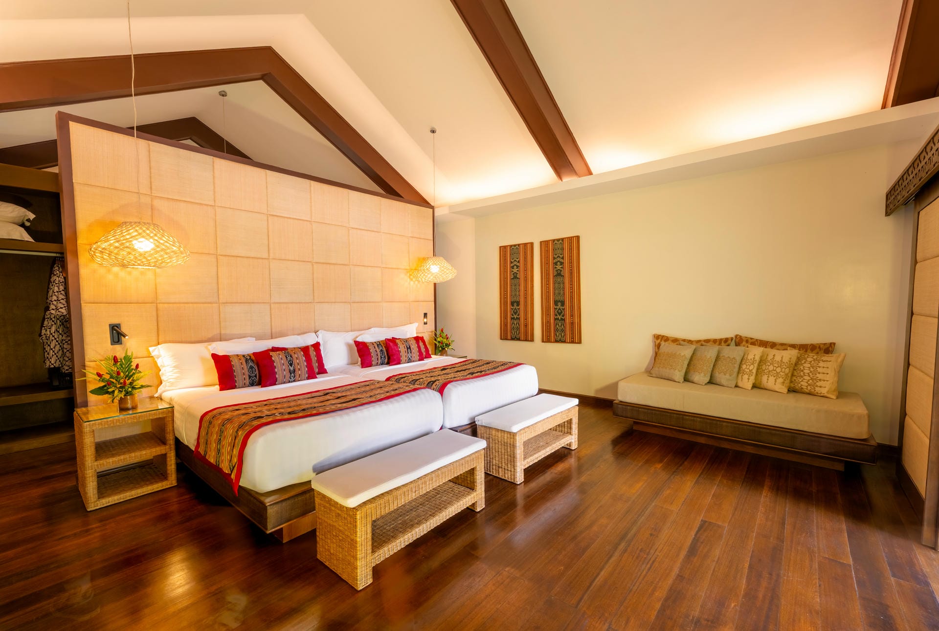 T’nalak headboards and banana-leaf wall finishes showcase Mindanao’s rich cultural heritage.