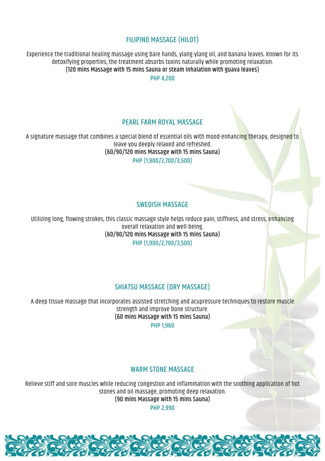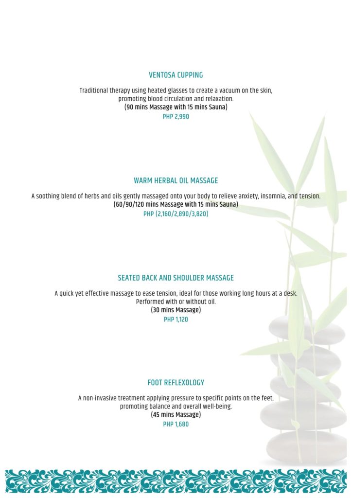 Using natural oils, soothing aromas, and gentle therapies rooted in Filipino wellness practices, each ritual is designed to release tension, restore balance, and quiet the mind.